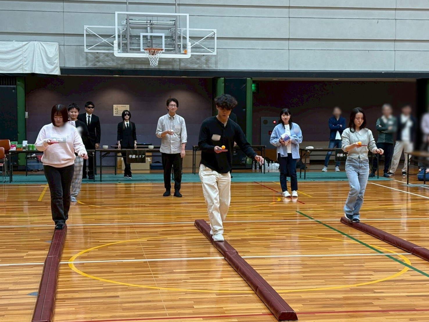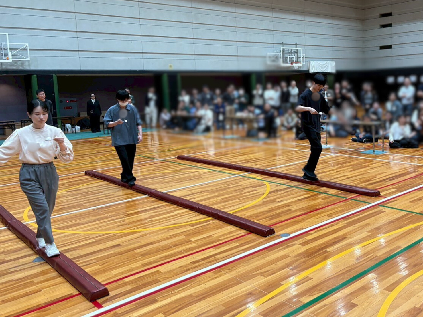 各チームから 代表者2名 がステージへ上がり、実際の鉄骨に見立てた平均台を、アイテムを持った状態で渡りきります。