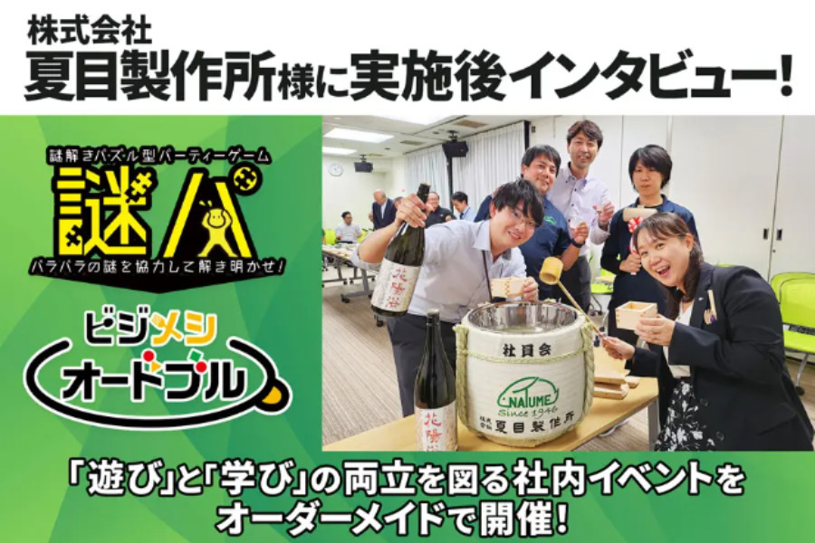 2023年10月14日(土)、株式会社夏目製作所様(以下:夏目製作所様)の全社研修・懇親会にて、株式会社IKUSAが提供する謎解きパズル型研修「謎パ」及びフードデリバリーサービス「ビジメシオードブル」をご利用いただきました。