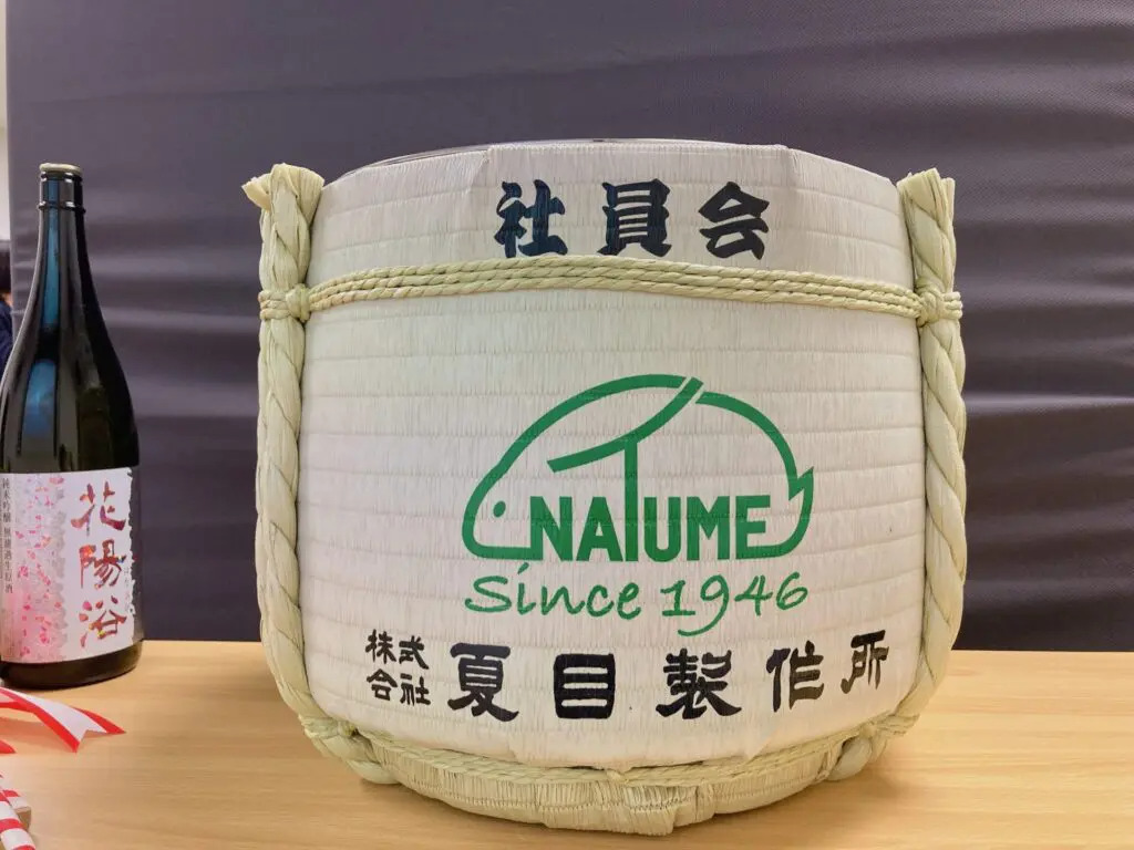 懇親会の途中で登場したのはなんと、夏目製作所様のロゴがデザインされた立派な酒樽!