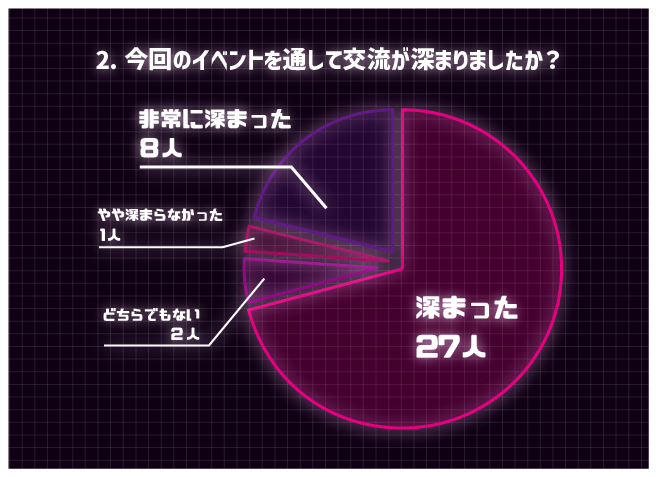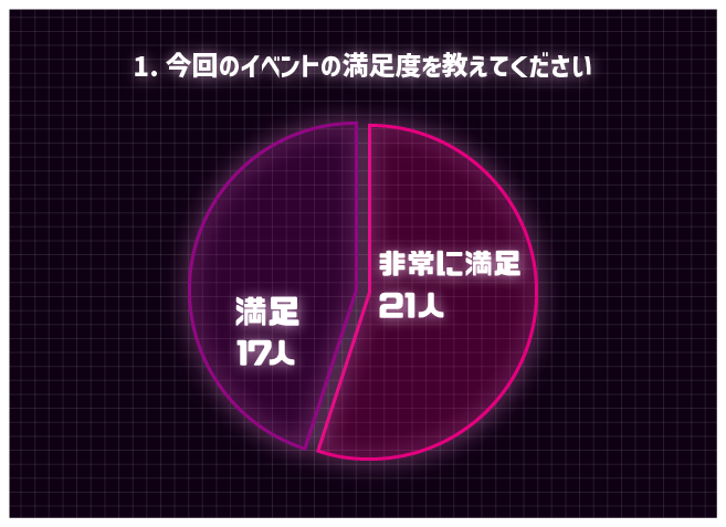 イベント後の満足度アンケートでは、「非常に満足」が過半数を占めました。参加者様同士それぞれが、イベントとして謎解きを楽しみ、積極的にコミュニケーションを取られたようです。
