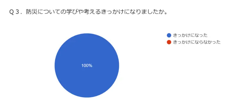 また、「防災についての学びや考えるきっかけになったか」という質問に対しても「きっかけになった」と回答いただいた人の割合もなんと100%でした!